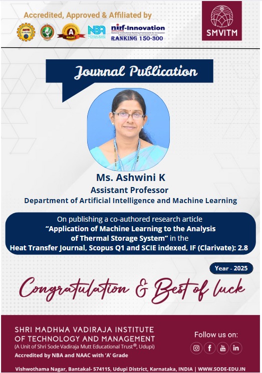 Ms. Ashwini K, Assistant Professor in the Department of Artificial Intelligence and Machine Learning at SMVITM, has co-authored a significant research article titled “Application of Machine Learning to the Analysis...