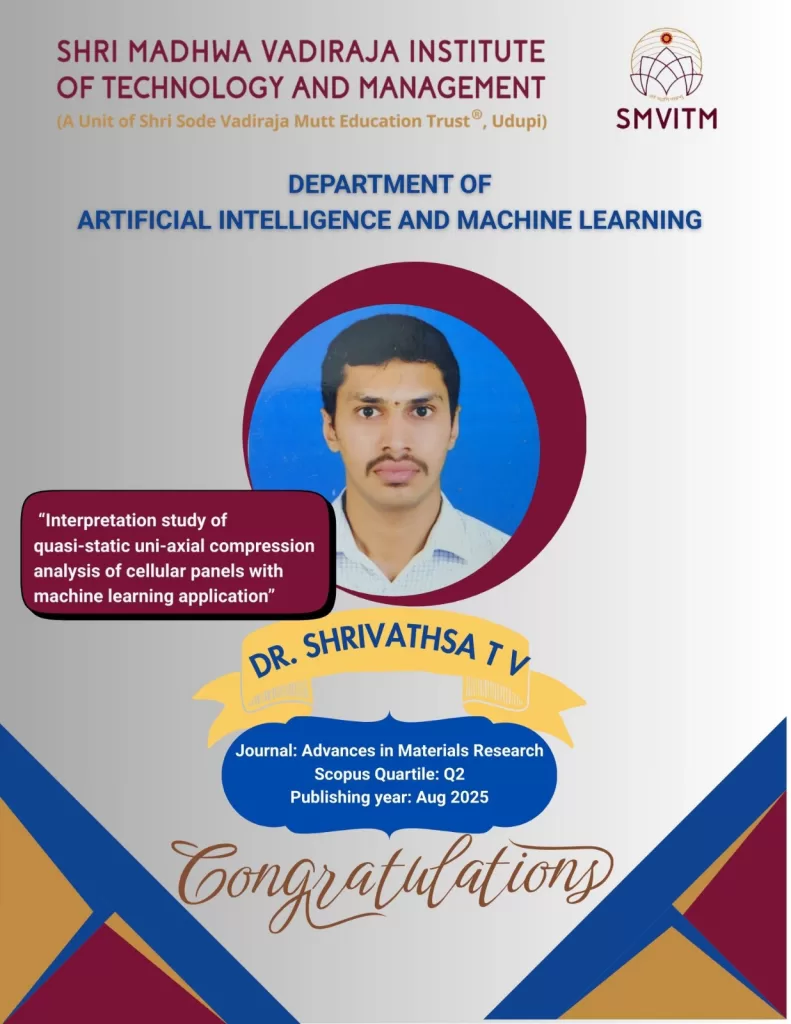 Dr. Shrivathsa T V, Department of Artificial Intelligence and Machine Learning, for his significant research achievement. His paper titled “Interpretation study of quasi-static uni-axial compression analysis of cellular panels with...