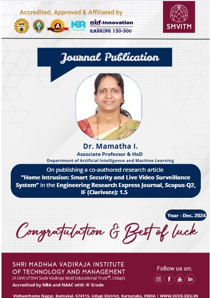 Congratulations to Dr. Mamatha I., Associate Professor & HoD, Department of AI & ML, for her recent publication in the Engineering Research Express Journal (Scopus-Q2). The research, titled “Home Intrusion:...