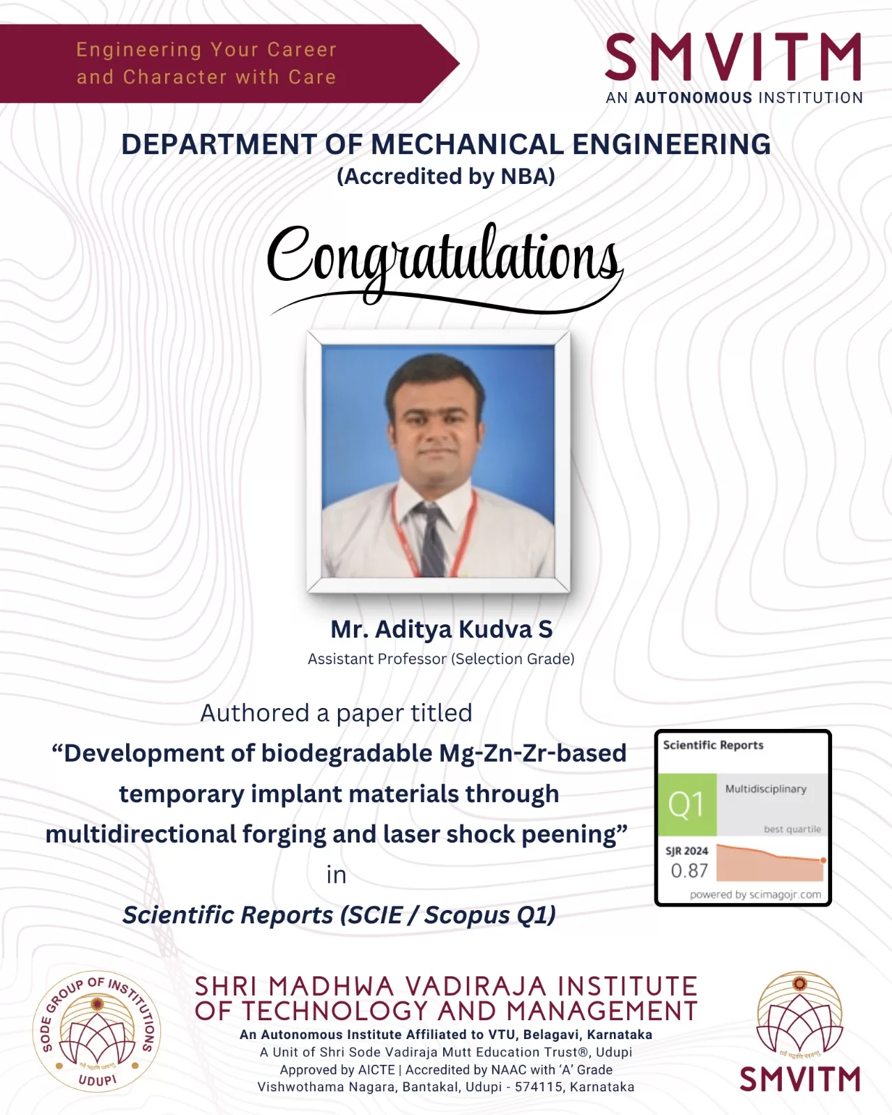 The Department of Mechanical Engineering (Accredited by NBA), Shri Madhwa Vadiraja Institute of Technology and Management (SMVITM), congratulates Mr. Aditya Kudva S, Assistant Professor (Selection Grade) on authoring a research paper titled “Development of biodegradable Mg-Zn-Zr-based temporary implant materials through multidirectional forging and laser shock peening”, published in Scientific Reports (SCIE / Scopus Q1). This achievement reflects his dedicated research efforts and contributes significantly to the advancement of materials engineering and biomedical implant development. The institute appreciates and applauds his accomplishment and wishes him continued success in his future research endeavours.