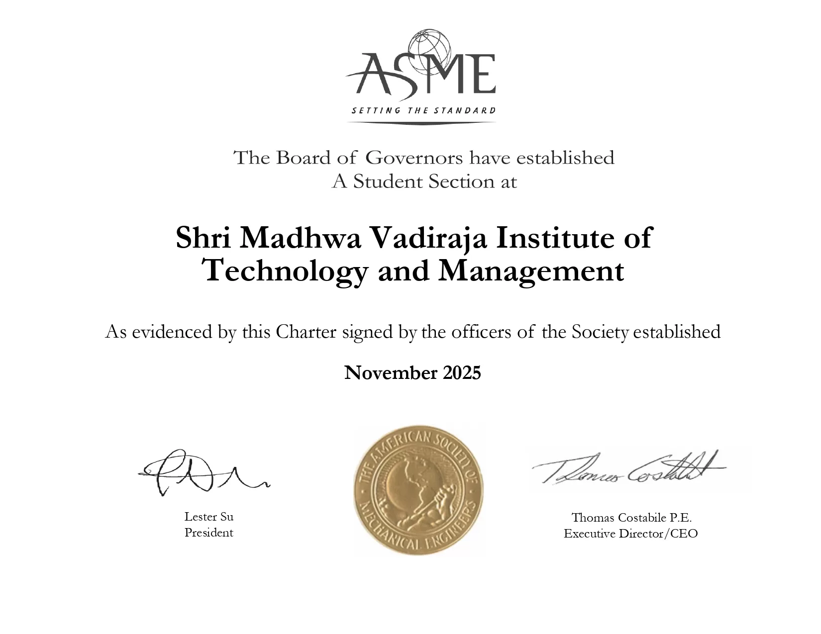 Shri Madhwa Vadiraja Institute of Technology and Management (SMVITM) has been officially recognized as an ASME Student Section by the prestigious American Society of Mechanical Engineers (ASME). The charter, issued in November 2025, marks a significant milestone for the institution and the Department of Mechanical Engineering, strengthening professional engagement and technical learning opportunities for students. This recognition will encourage students to participate in ASME-led activities, workshops, technical events, and collaborative initiatives, thereby enhancing their exposure to global engineering standards and industry-focused learning.
