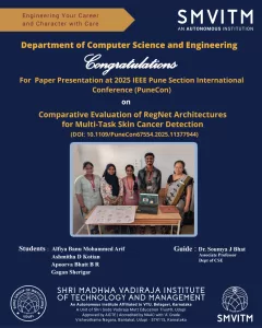 The Department of Computer Science and Engineering, SMVITM, proudly congratulates its students for presenting a research paper at the 2025...