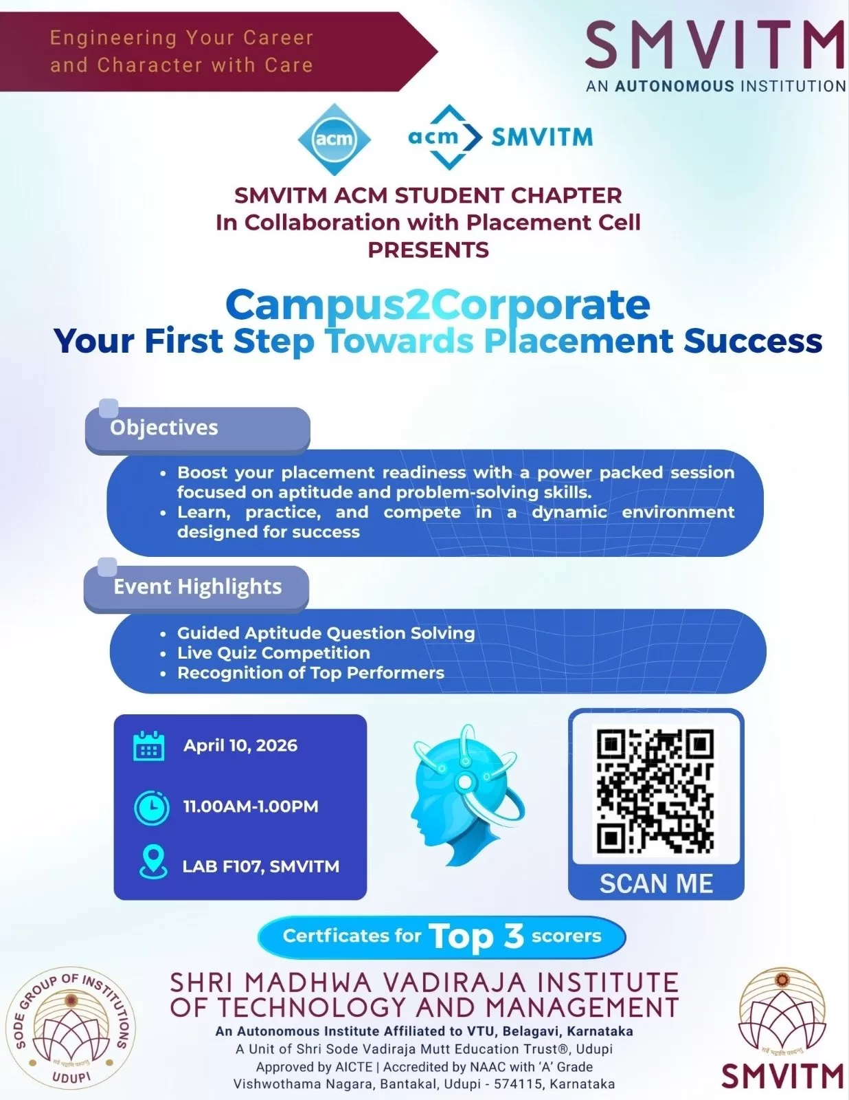 The SMVITM ACM Student Chapter, in collaboration with the Placement Cell at Shri Madhwa Vadiraja Institute of Technology and Management (SMVITM), successfully organized an aptitude-focused event titled “Campus2Corporate – Your First Step Towards Placement Success” on April 10, 2026, at Lab F107. The session was held from 11:00 AM to 1:00 PM and saw enthusiastic participation from students eager to strengthen their placement preparation.