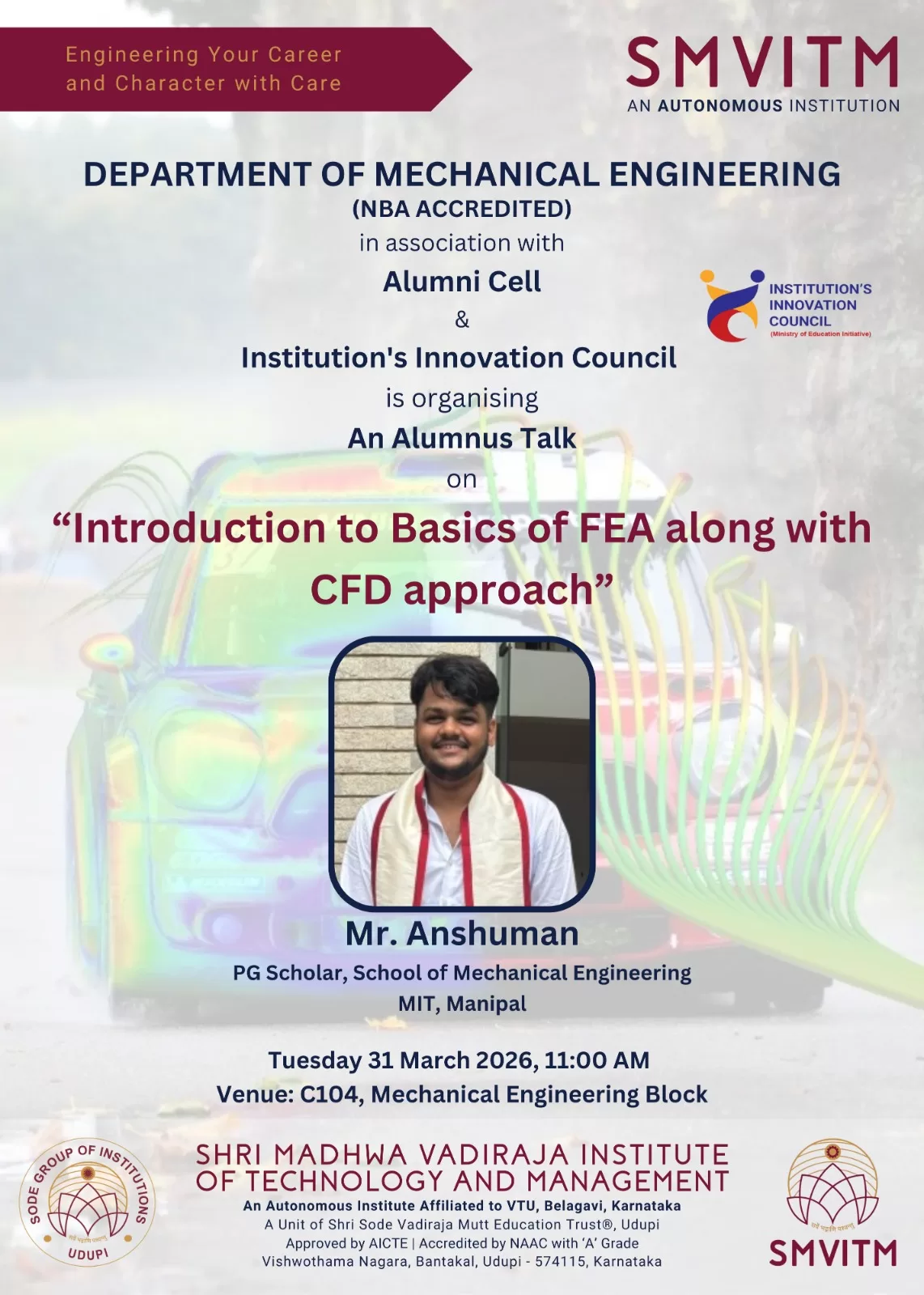 The Department of Mechanical Engineering, in association with the Alumni Cell and Institution’s Innovation Council, organized an alumnus talk on “Introduction to Basics of FEA along with CFD Approach” on 31 March 2026 at the Mechanical Engineering Block.