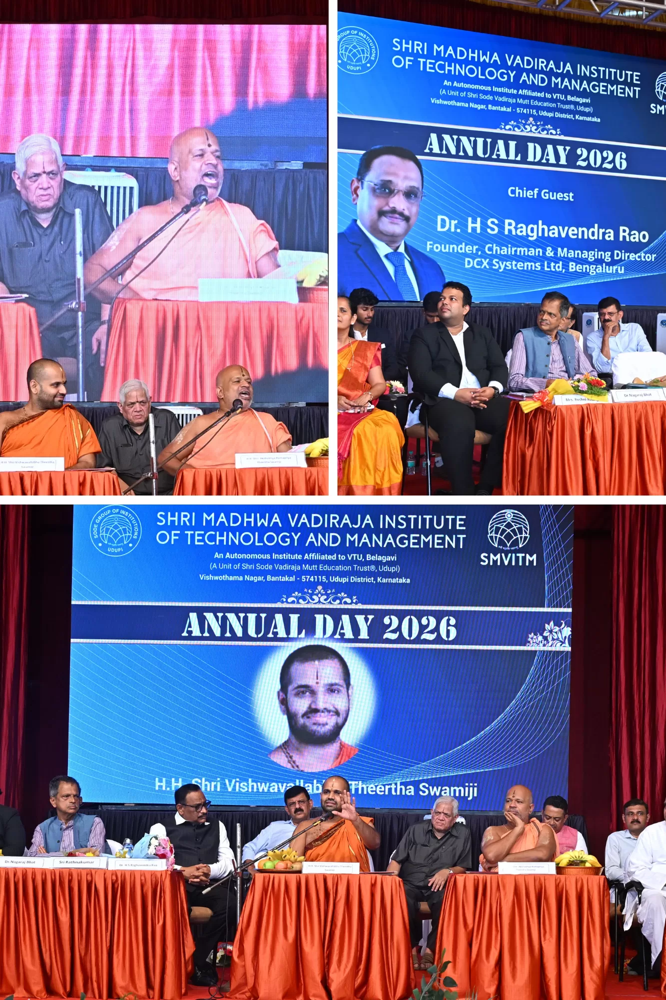 The programme was presided over by Paramapoojya Shri Vishwavallabha Theertha Swamiji, President of Shri Sode Vadiraja Matha Education Trust (SSVMET), Udupi. In his presidential address, Swamiji referred to the moral story of the three fishes to highlight the importance of foresight and proactive thinking. He urged students to develop a visionary outlook and avoid procrastination. Linking this wisdom to the vision of a self-reliant India, he appreciated the contributions of innovators such as Dr. Raghavendra H. S. Rao, who are strengthening the nation through indigenous technological development, and blessed him during the occasion.