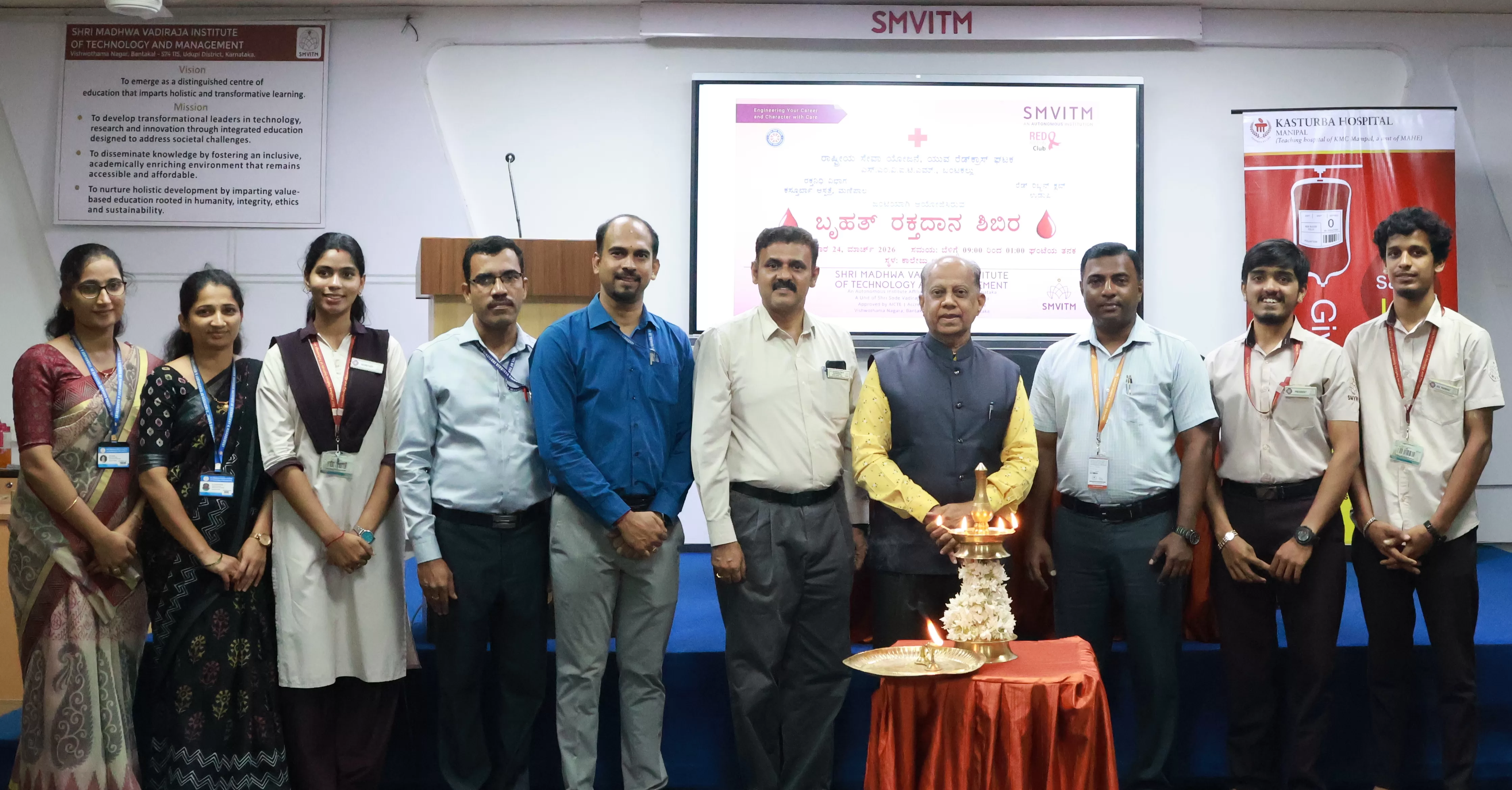 Shri Madhwa Vadiraja Institute of Technology and Management (SMVITM), Bantakal, successfully organized a mega blood donation drive on 25 March 2026, that witnessed an overwhelming response, collecting more than 140 units of blood. The initiative was conducted by the NSS-YRC Unit of the institute in collaboration with the KMC Blood Centre, Manipal.