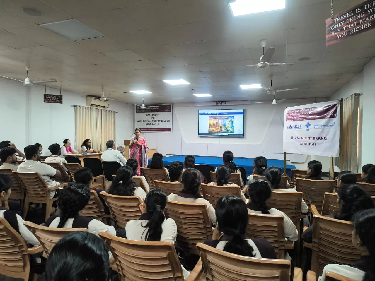 The Department of Electronics and Communication Engineering, SMVITM, in association with IEEE CEDA, organized a guest talk titled “Device to Design: Transistor to Circuit” on 02 March 2026 at the Seminar Hall, Admin Block. The session was delivered by Ms. Rajeela Deshpande, Associate Director, Samsung Semiconductor India Research, Bengaluru, for VI Semester EC students.