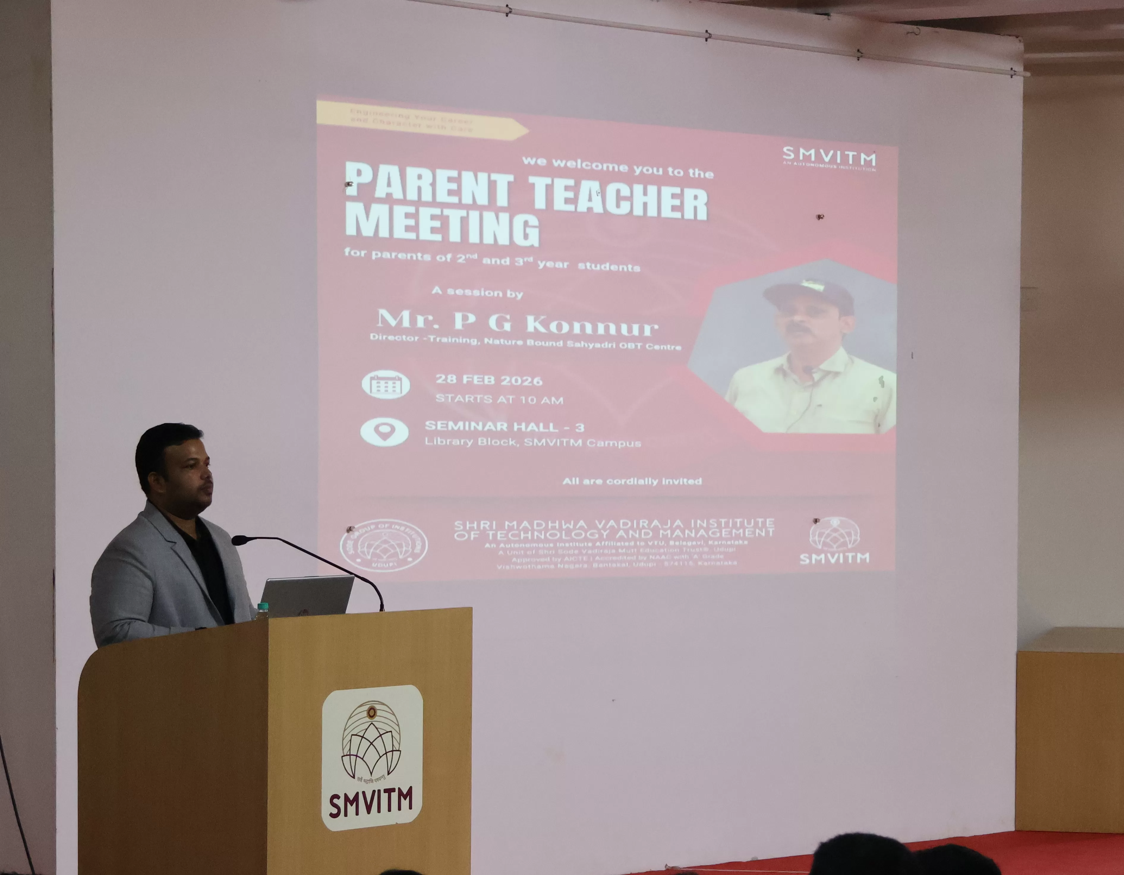 Shri Madhwa Vadiraja Institute of Technology and Management (SMVITM), Bantakal, organized a Parent–Teacher Meeting for the parents of 2nd and 3rd year students on 28 February 2026. The program began with a welcome, invocation, and floral reception.