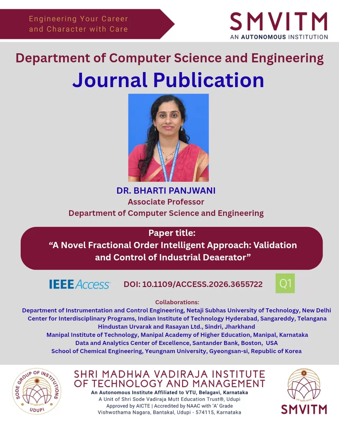 The Department of Computer Science and Engineering, SMVITM, proudly announces that Dr. Bharti Panjwani, Associate Professor, has published a research paper in the prestigious IEEE Access (Q1) journal.