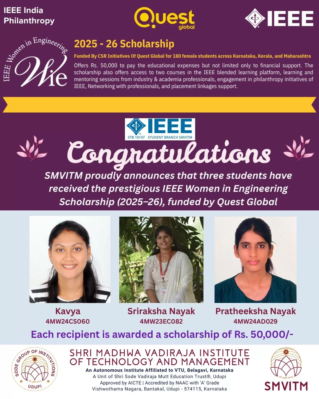 Three students have been awarded the prestigious IEEE Women in Engineering (WIE) Scholarship for the academic year 2025–26, funded by Quest Global.
