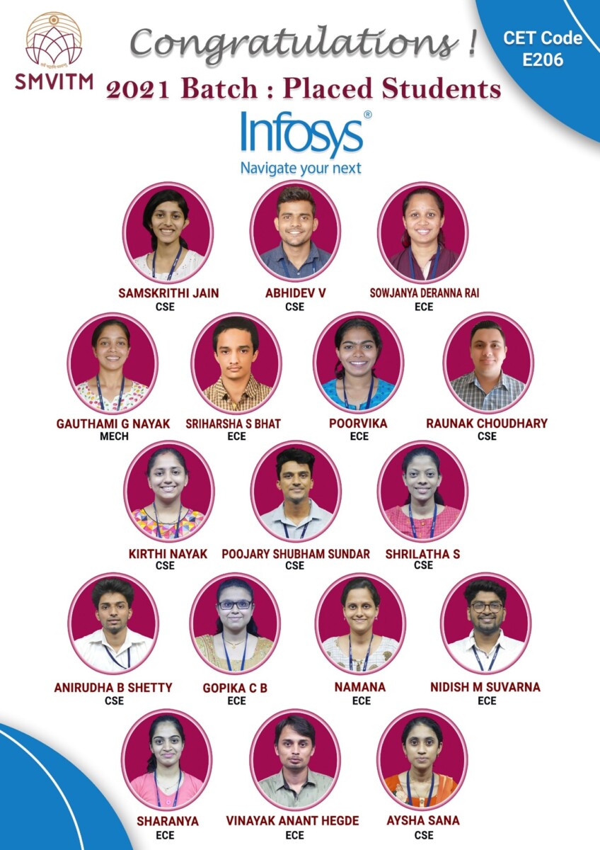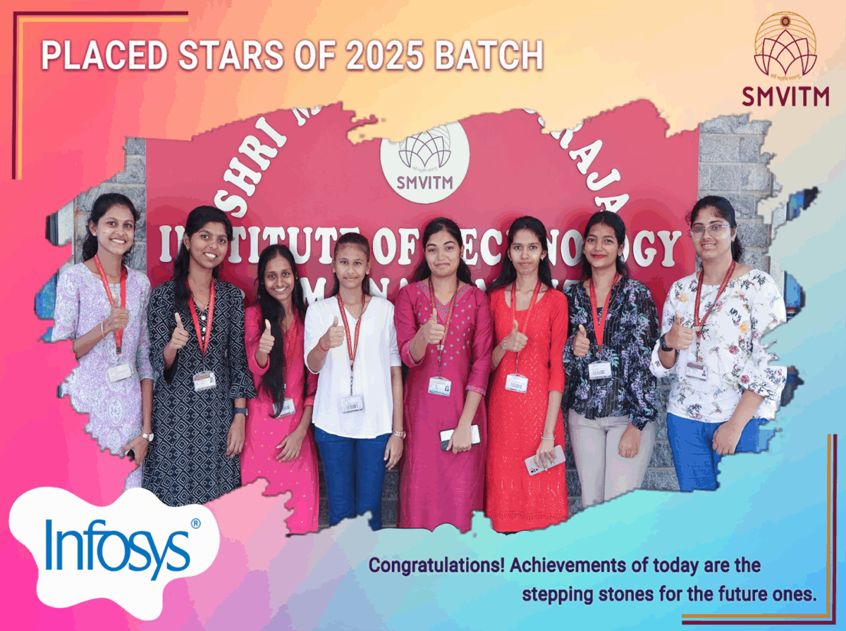 Through our rigorous academic programs and customized training sessions, SMVITM ensures students are equipped to meet Infosys’s hiring expectations. Emphasis is placed on building coding proficiency, problem-solving capabilities, and communication finesse, along with personality development to help students thrive in corporate environments like that of Infosys.